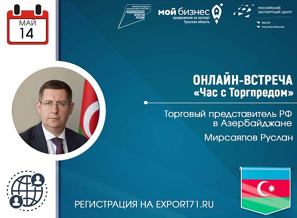 Торговый представитель Российской Федерации в Азербайджанской Республике Мирсаяпов Руслан Загитович расскажет о перспективных направлениях двухстороннего сотрудничества, а также ответит на вопросы тульских экспортеров.