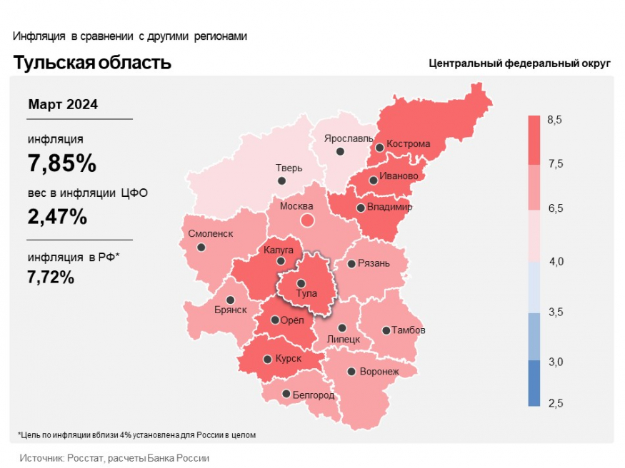 Годовая инфляция в Тульской области в марте 2024 года увеличилась и составила 7,85% после 7,53% в феврале 2024 года.