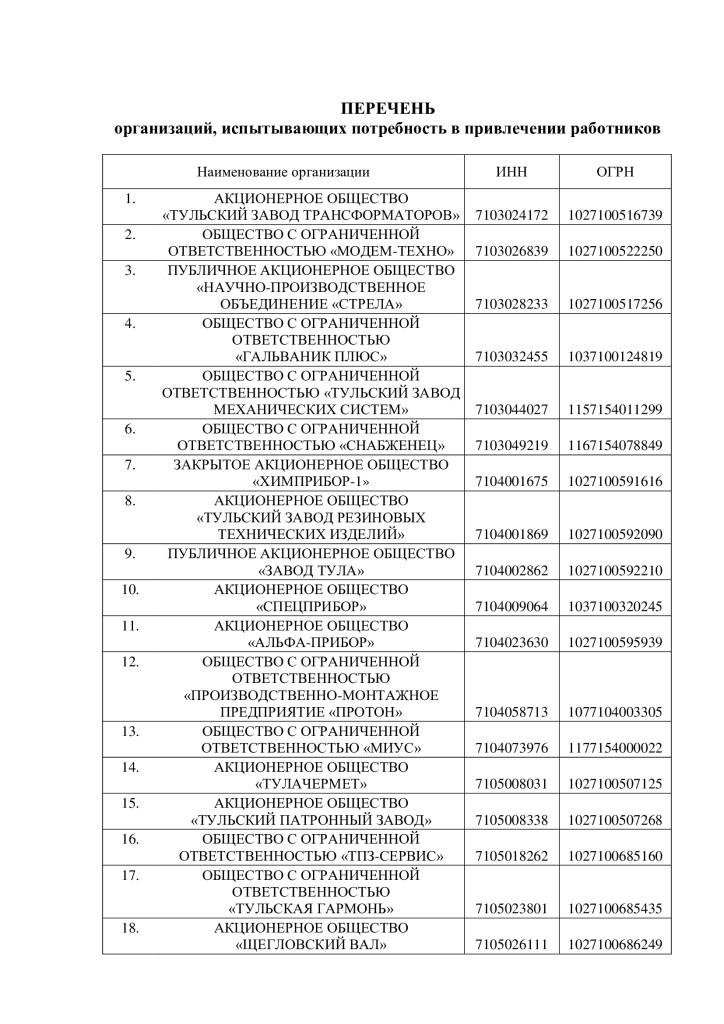 Правительство Тульской области утвердило перечень предприятий, которые наиболее остро нуждаются в новых рабочих кадрах. Также стал известен список востребованных профессий. Сведения опубликованы на сайте органа власти. В документе указана 71 организация, испытывающая потребность в привлечении работников. В их числе НПО «Стрела», «Тулачермет», «Щегловский вал», КБП имени академика А.Г. Шипунова», завод «ШТАМП», «Туламашзавод», Императорский Тульский оружейный завод, «Тулаточмаш» и многие другие.