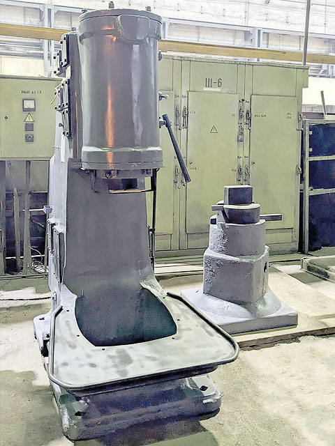 Ковочный пневматический молот доставлен в ремонтно-механический цех. Масса падающих частей молота составляет 160 кг, частота ударов в минуту – 190.