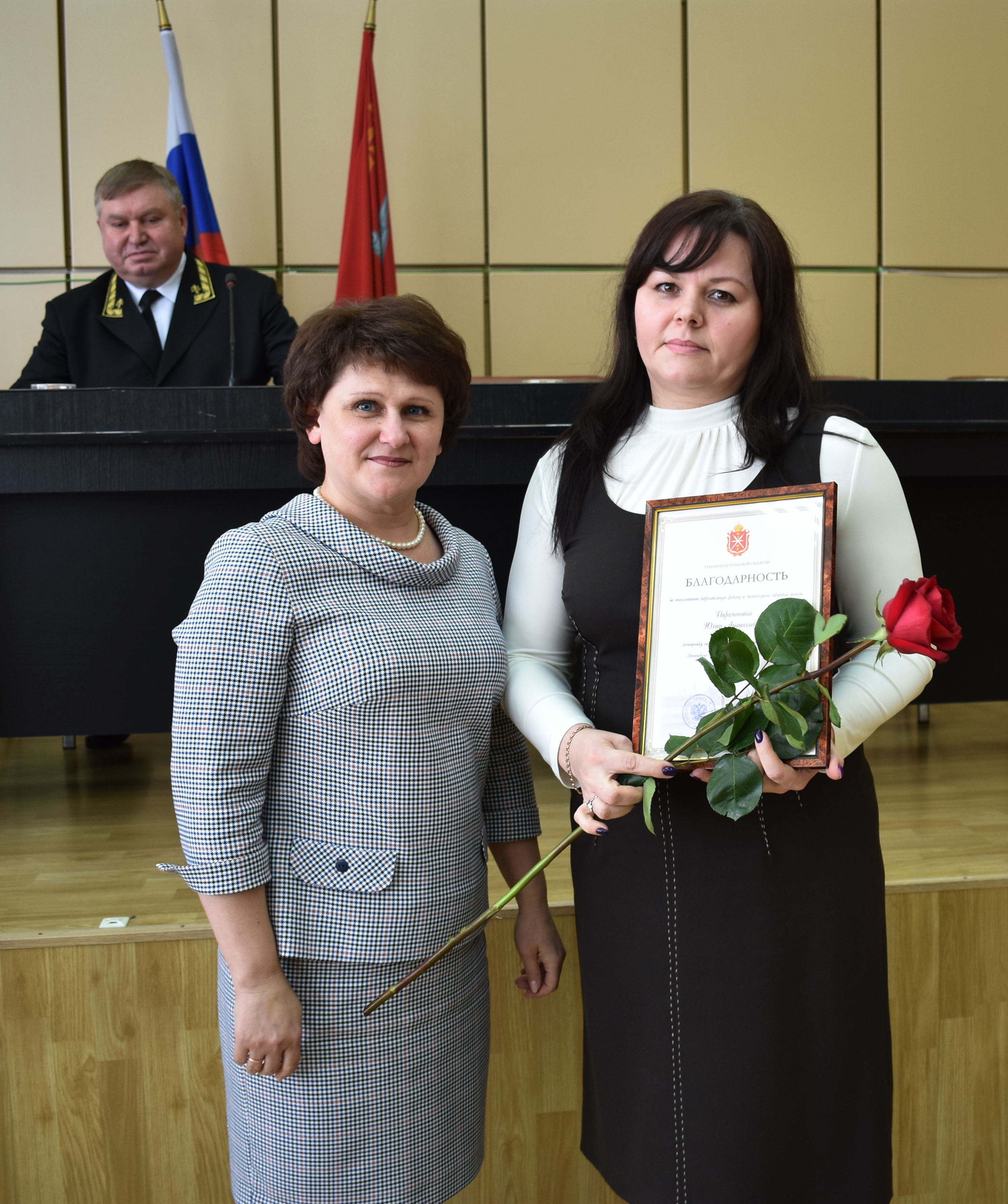 За многолетнюю добросовестную работу и достигнутые трудовые успехи Благодарность Губернатора Тульской области объявлена: Парамоновой Юлии Анатольевне – помощнику мирового судьи судебного участка № 28 Ленинского судебного района Тульской области. Почетной грамотой Правительства Тульской области награждены: Иванова Ирина Сергеевна – консультант отдела организации деятельности, исполнения бюджета и контроля комитета по делам записи актов гражданского состояния и обеспечению деятельности мировых судей в Тульской области Куприна Вера Борисовна - начальник отдела организации деятельности, исполнения бюджета и контроля комитета по делам записи актов гражданского состояния и обеспечению деятельности мировых судей в Тульской области Андросова Елена Николаевна - помощник мирового судьи судебного участка № 27 Ленинского судебного района Тульской области.