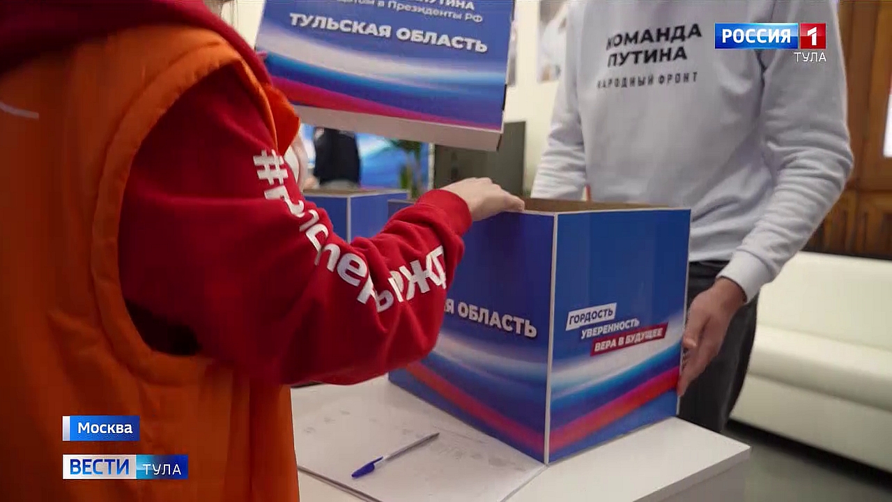 В центральном избирательном штабе Владимира Путина продолжают принимать подписи в поддержку его выдвижения на должность Президента России. В числе первых волонтёры из Тульской области доставили партию подписей земляков, жителей городов и районов нашего региона. Стартовавший в конце декабря сбор подписей осуществлялся волонтёрами, активистами ОНФ во многих населённых пунктах.