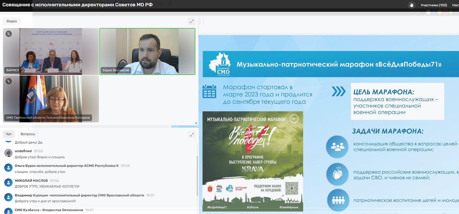 Исполнительный директор Ассоциации «Совет муниципальных образований Тульской области» Борис Воловатов сегодня выступил на совещании с исполнительными директорами Советов МО РФ на тему организации и проведения музыкально-патриотического марафона в поддержку участников СВО #ВсеДляПобеды71.