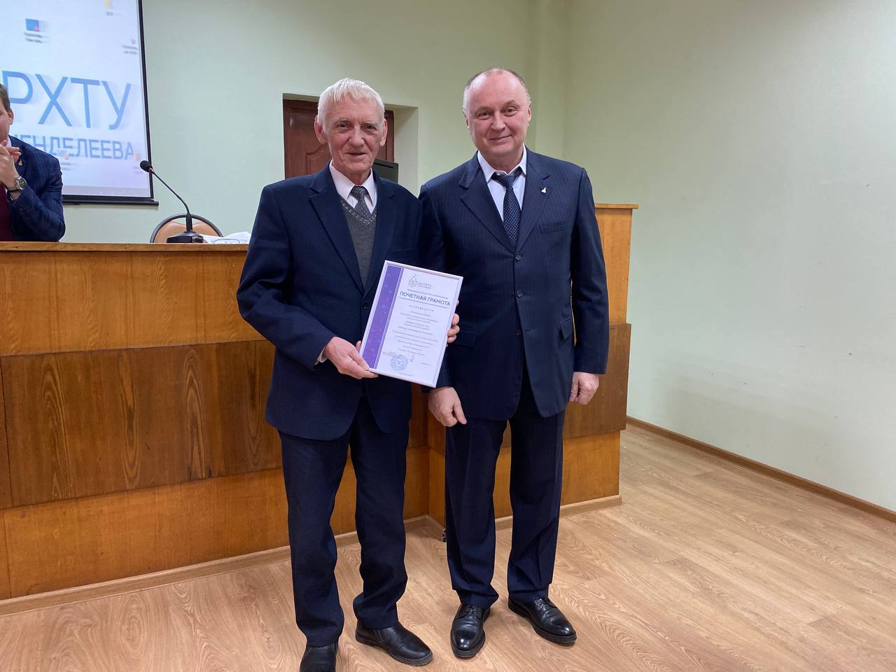 Почетной грамотой Новомосковского института за долголетнюю качественную, творческую работу, личный вклад в развитие и процветание Новомосковского института РХТУ им. Д.И. Менделеева и в связи с 70-летним юбилеем был награжден А.А. Алексеевич - заведующий кафедрой ТКНиМС