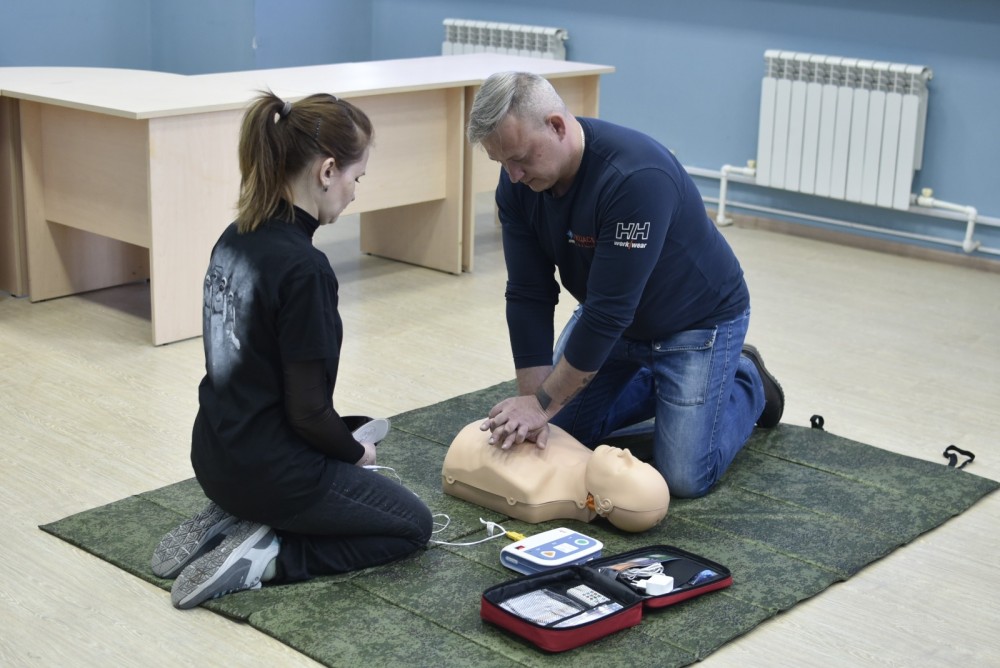 С основными приемами оказания первой медицинской помощи сотрудников предприятия познакомили инструктор по ПМП Полещук Полина Владимировна, а также преподаватель ПМП Пилюгин Алексей Александрович. Во время проведения мастер-класса специалисты АНО ДПО УКЦАСФ им. Никулина показывали, как правильно проводится сердечно-легочная реанимация, в том числе с применением автоматического лёгочного дефибриллятора, объясняли порядок действий по оказанию первой помощи при попадании в горло инородного тела, а также обучали способам проведения непрямого массажа сердца.
