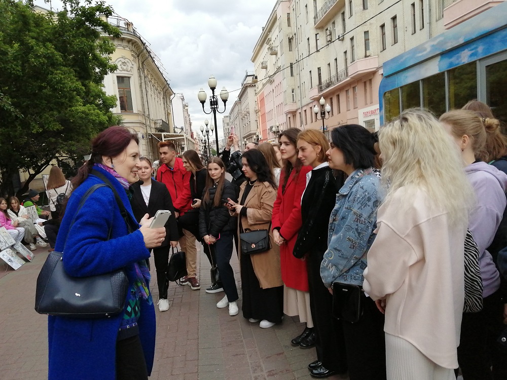 Посещение столицы студенты начали с самой знаменитой улицы Москвы – Арбата. Познакомиться с историей старейшей улицы и небольших очаровательных переулков центра студентам помогла заместитель декана лингвистического факультета Института лингвистики и межкультурной коммуникации Государственного университета просвещения (ГУП), кандидат филологических наук Ирина Ивановна Донскова.