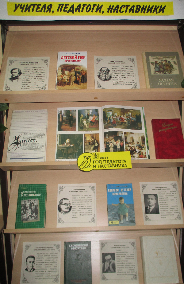 Городской филиал №2 представляем выставку-персоналию о выдающихся российских педагогах «Учителя, педагоги, наставники...», посвященную Году педагога и наставника. Образование в жизни общества всегда было значимо: оно развивало экономику государств, воспитывало культуру поведения людей.