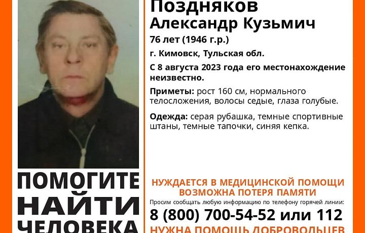 В Тульской области пропал 76-летний мужчина Поздняков Александр Кузьмич из Кимовска. Местонахождение мужчины неизвестно с 8 августа 2023 года.