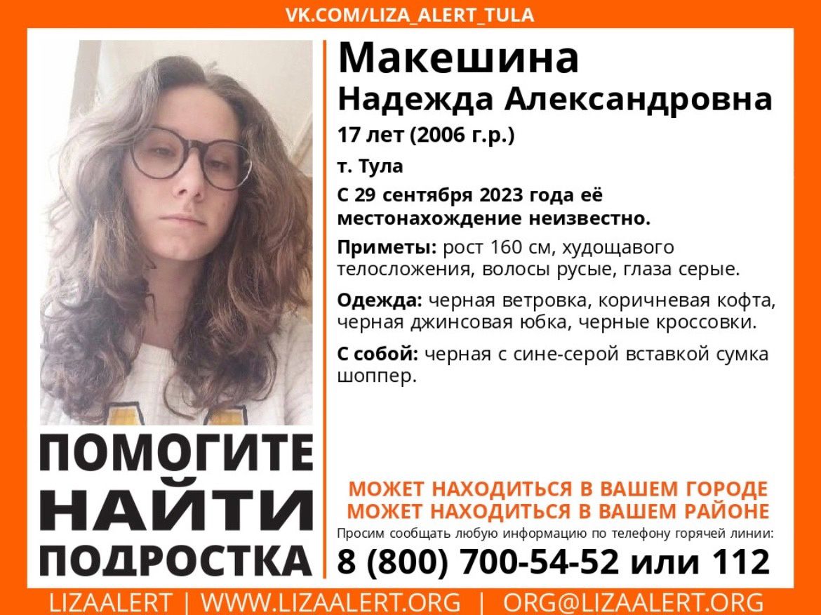 Поисковики отряда «ЛизаАлерт» снова обращаются за помощью к тулякам. Накануне 17-летняя Надежда Макешина перестала выходить на связь с близкими.