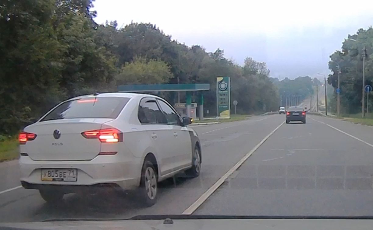 «На подъезде к реке Воронке, напротив АЗС — обгон под запрещающий знак с пересечением сплошной линии разметки и выездом на встречную полосу движения автомобилем Volkswagen с государственным регистрационным знаком у805ве71. Далее, через 100 метров, на мосту данный автомобиль повторил обгон через сплошную, с выездом на встречную полосу. По этой машине я уже высылал видеоматериал в ГИБДД с обгоном в том же месте 24.07.2023. Видимо, его или не привлекли, или наплевать», — сообщил автор видео.