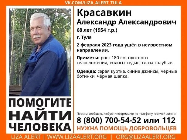 Тульской области начались поиски пропавшего красавкина Александра Александровича, сообщили волонтёры поисково-спасательного отряда Лиза Алерт.
