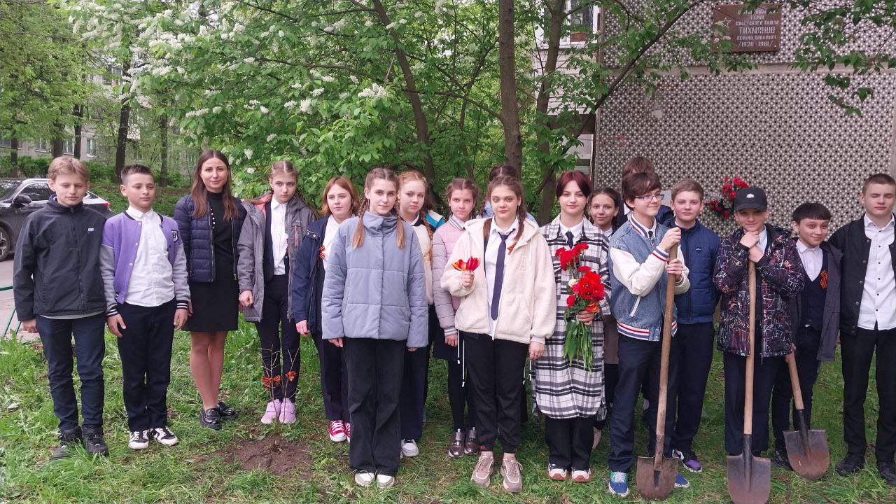 Урок продолжился на свежем воздухе. Анастасия Дементьева вместе с ребятами возложили цветы к памятнику Леониду Павловичу Тихмянову и посадили саженцы дуба.