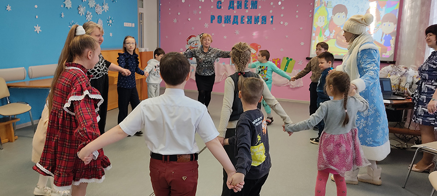 Звонкой и радостной состоялась встреча ребят с Зимушкой и Снеговиком (педагоги полустационарного отделения реабилитации детей с ОВЗ), аниматором Надеждой (Розочкой - героиней известного детского мультфильма «Барбоскины»). Они радостно играли с детьми, предлагали увлекательные игры и совместно с ребятами, весело участвовали в досуговой программе. Детям представилась возможность поучаствовать в конкурсах, поиграть и потанцевать.