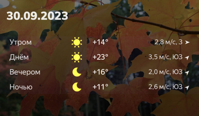 ПОГОДА30 сентября, в Тульской области, в дневные часы воздух прогреется до +23 градусов. В вечернее время термометры покажут +16 градусов. Ночью температура опустится до отметки +11 градусов. Сообщают синоптики «Яндекс. Погоды».