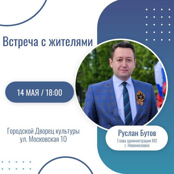 14 мая в Городском Дворце культуры на улице Московская, д. 10 состоится встреча жителей с главой администрации муниципального образования город Новомосковск Русланом Владимировичем Бутовым.В ходе общения, в формате "открытый микрофон", вы сможете задать свои вопросы, озвучить проблемные моменты напрямую главе администрации города.