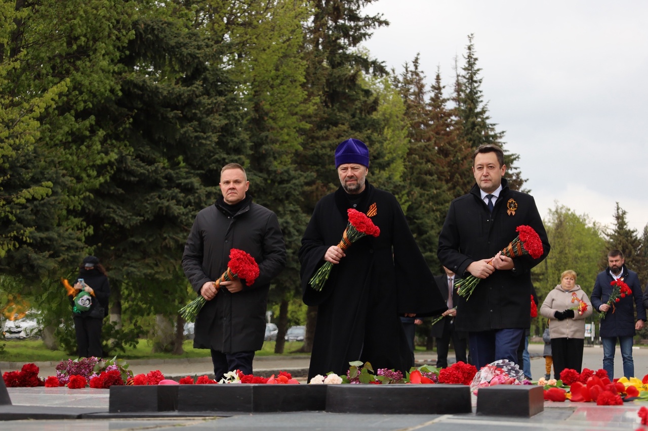 Новомосковцы торжественно возлагают цветы и венки на мемориальном комплексе в Парке Памяти и Славы и к монументу Вечной славы на Московской.