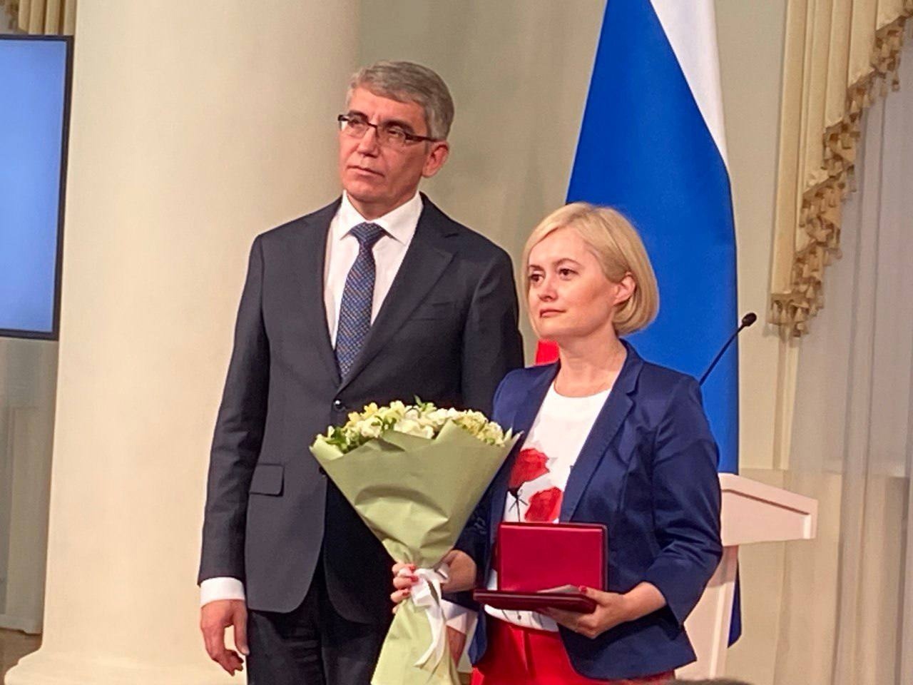 Среди двадцати четырех награждённых - учитель русского языка и литературы школы №2 Новомосковска Оксана Крюкова. Из рук Дмитрия Миляева она получила присвоенную ранее награду «Заслуженный учитель Российской Федерации».