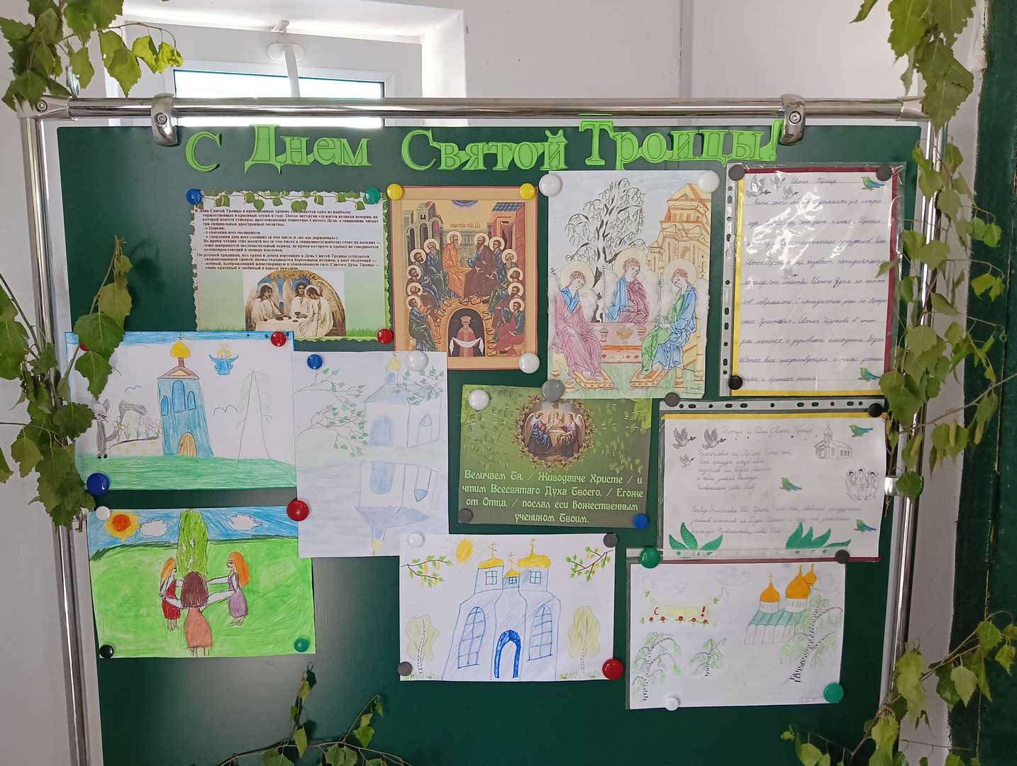 Юные прихожане Казанского храма села Дубики оформили праздничный стенд к празднику Святой Троицы.