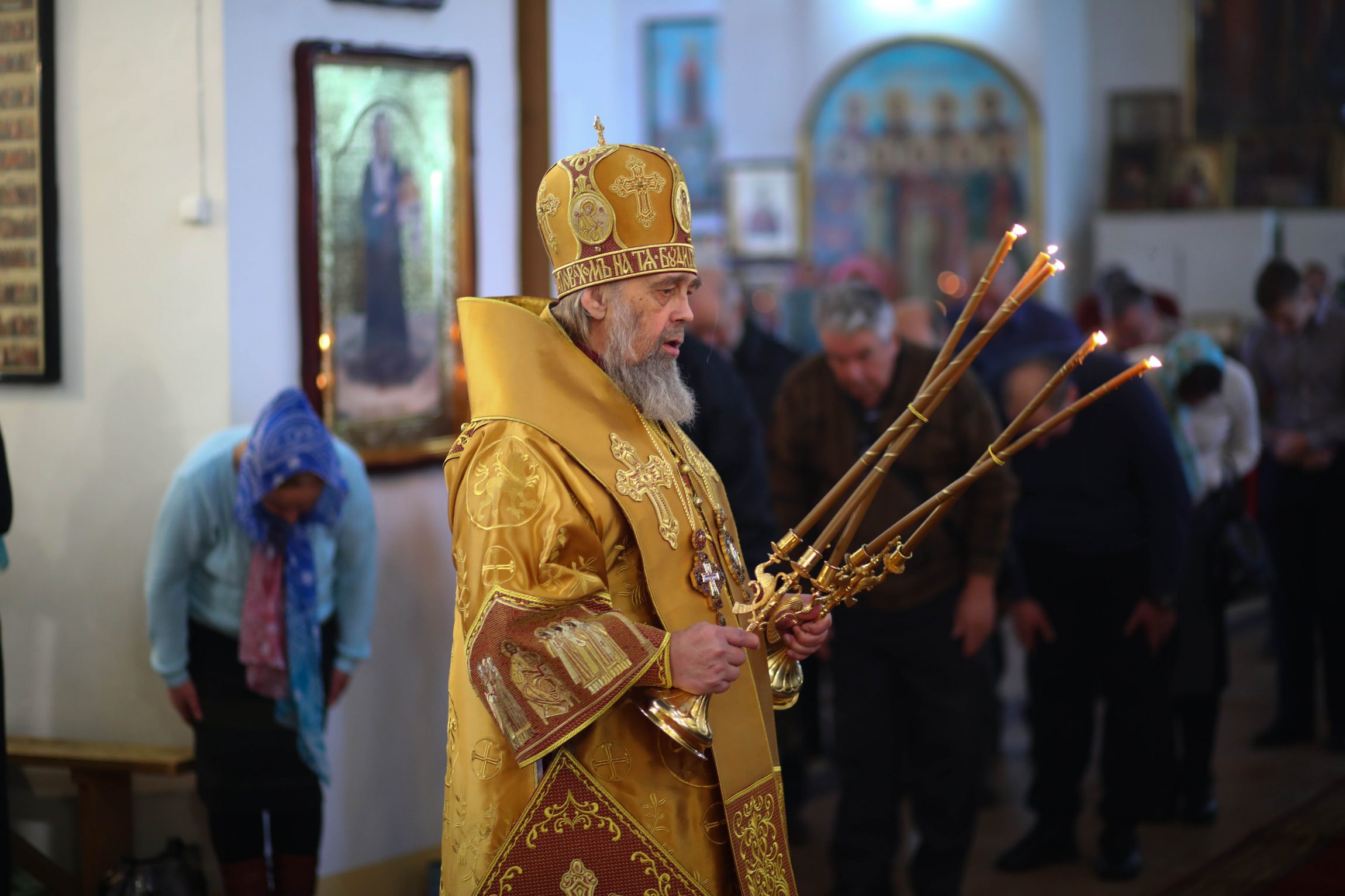На сугубой ектении вознесены молитвы о благопоспешении христолюбивому Российскому воинству в установлении мира в сию лихую годину, на Святую Русь нашедшую, о мире на Украине, а также о сохранении единства святого Православия.