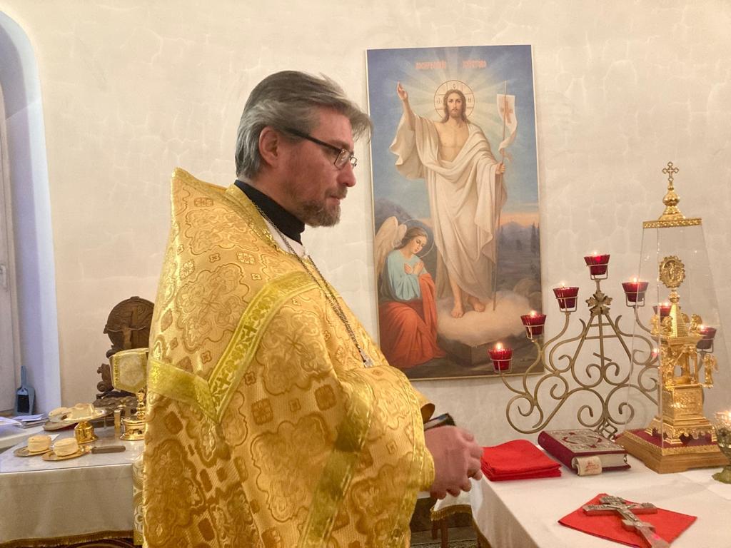 На сугубой ектении вознесены молитвы о благопоспешении христолюбивому Российскому воинству в установлении мира в сию лихую годину, на Святую Русь нашедшую, о мире на Украине, а также о сохранении единства святого Православия.