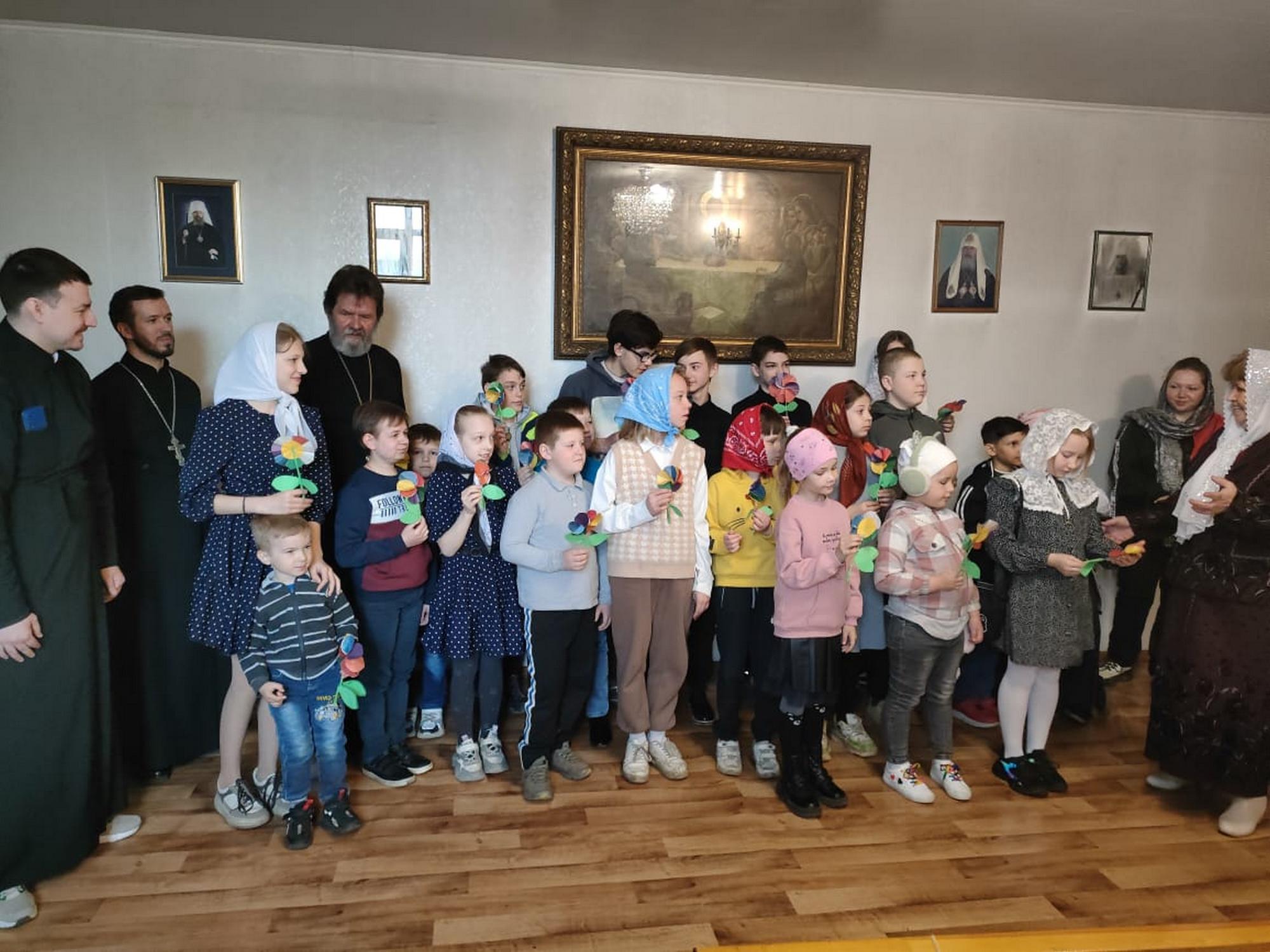 В начале занятия протоиерей Сергий Ковалевский обратился к воспитанникам воскресной школы, их мамам и бабушкам со словами поздравления. Отец Сергий отметил значимую роль женщин в христианском обществе, их верность Богу, труды и усердие в заботе о своих семьях и близких.