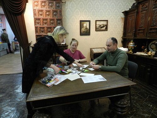 Продолжаются новогодние празднества. В череде светских и православных торжеств приближается особый великий день - Рождество Христово. В старых требниках его называют "Зимней Пасхой". На Руси сложилась добрая традиция преподносить в этот светлый день подарки. А во второй половине XIX столетия наряду с обычными поздравительными письмами по почте стали отправлять и "открытые", на лицевой стороне которых помещались изображения христианских сюжетов, зимних пейзажей, забавных детских игр. "Открытые карточки" или открытки, будучи вначале модным увлечением, быстро вошли в житейских обиход: их посылали не только дальним родственникам, которых не могли поздравить лично, но близким друзьям, и даже соседям. Особенно ценным и желанным подарком были "карточки", изготовленные собственными руками. 3 января, в преддверии Рождества, гости из Череповца и Домодедова посетили наш музей и побывали на мастер-классе "Приветы из прошлого". С огоньком в глазах, увлечённо они изготавливали праздничные открытки по предложенному шаблону, а затем подписали их венецианским пером.