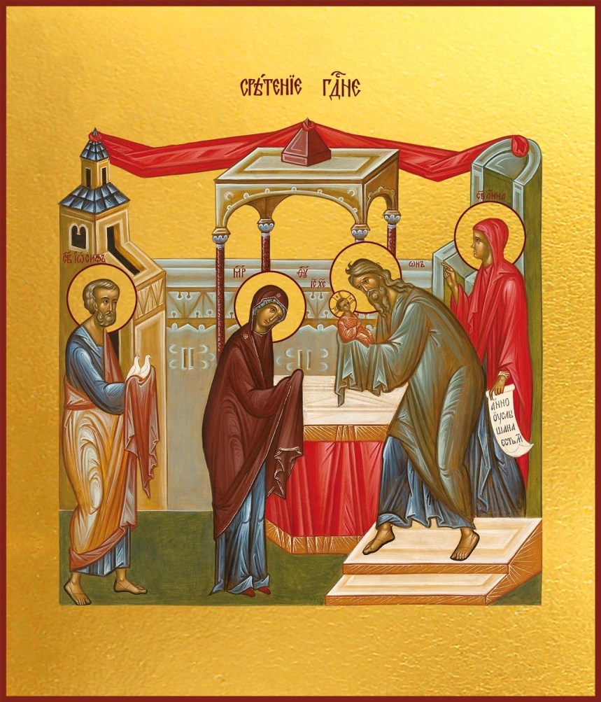 Иконография Сретения – иллюстрация повествования евангелиста Луки. Дева Мария передает Богомладенца на руки старцу Симеону – вот главный сюжет икон и фресок праздника. За спиной Богородицы изображается Иосиф Обручник; он несёт в руках или в клетке двух голубей. Позади праведного Симеона пишут Анну-пророчицу.