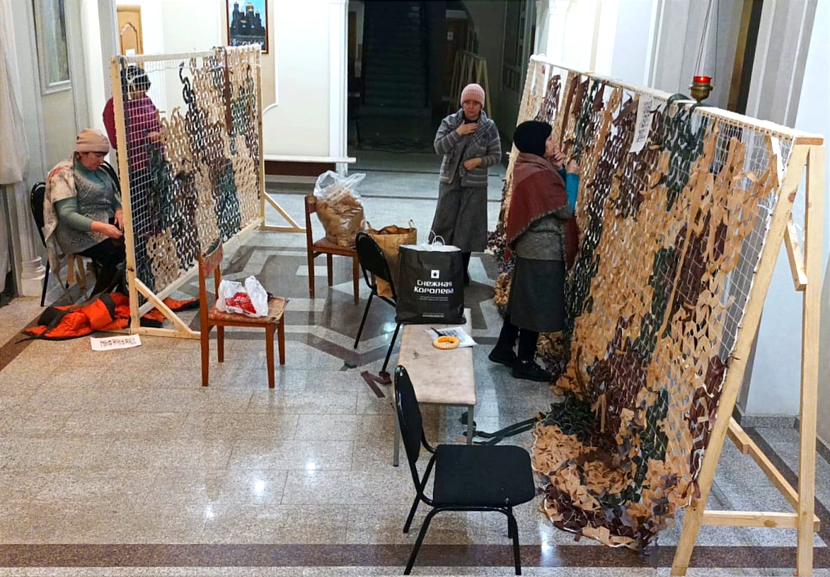 Прихожане-добровольцы регулярно собираются в церковном доме Сергиевского храма и плетут маскировочные сети для нужд фронта. На сегодняшний день готовы 20 сетей, 19 из которых отправлены в зону СВО и уже используются в бою.