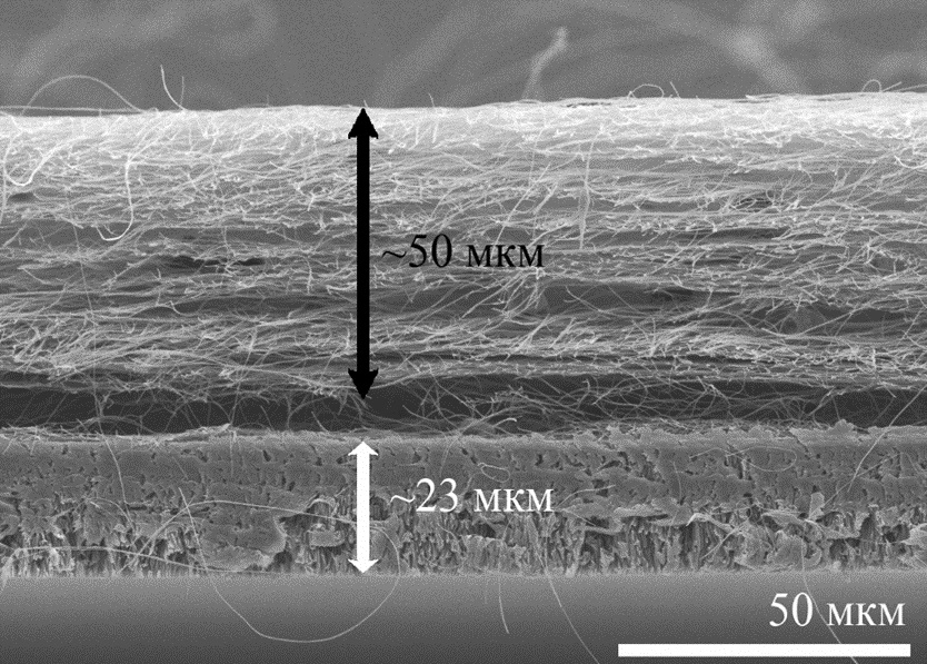 Микрофотография среза композитного материала с заданными медико-биологическими свойствами (черная двунаправленная стрелка – нановолоконный слой, белая двунаправленная стрелка – ПЭТФ ТМ + Ti)