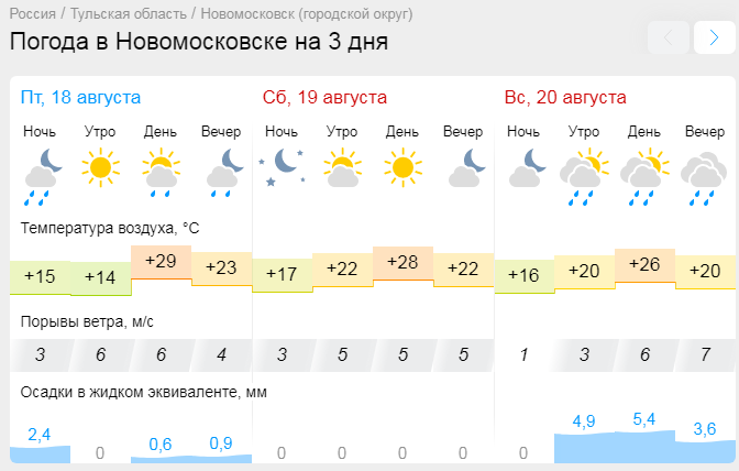 Так, уже в ночь на 19 августа в Тульской области может пройти небольшой дождь. Днем в субботу обойдется без осадков. При этом температура воздуха составит от 27 до 29 градусов тепла.