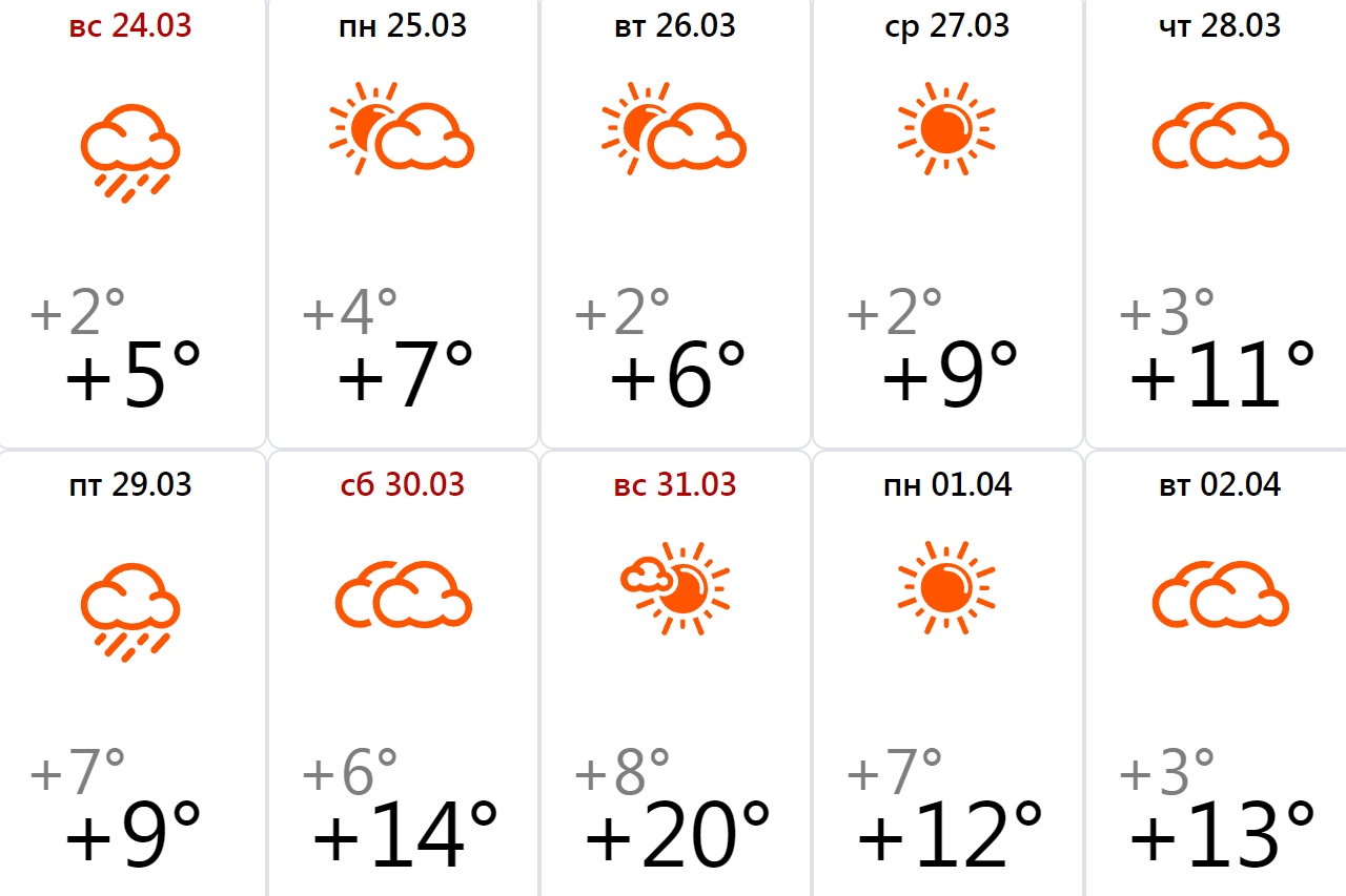 Судя по данным, предоставленным службой «Метеовести», всю последнюю неделю первого весеннего месяца в регионе ожидается устойчивое повышение температуры воздуха – от +2 до +8 градусов 31 марта по ночам и от +5 до +20 градусов в дневные часы.