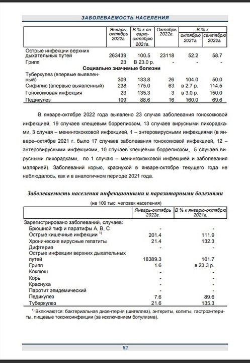 Помимо этого, в публикации говорится, что в октябре 2022 года по сравнению с сентябрем инфекционная заболеваемость населения снизилась на 46.8 %. При этом возросла заболеваемость острыми гепатитами, хроническими вирусными гепатитами, сифилисом, гонококковой инфекцией.