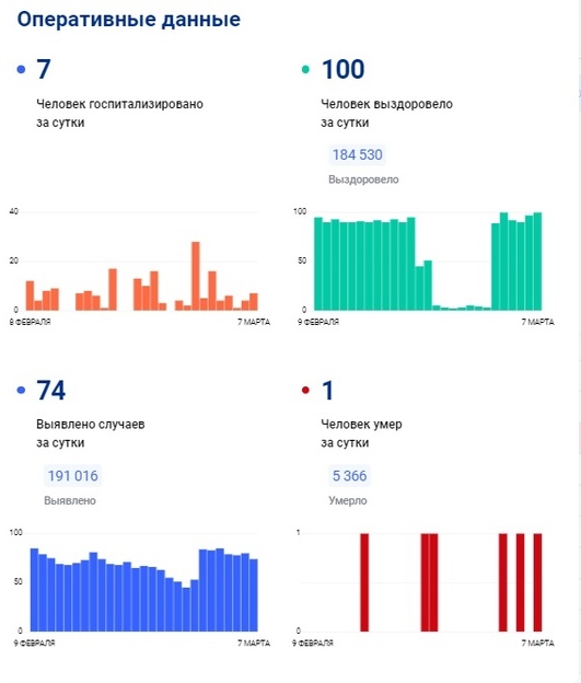 По данным на 7 марта, 7 человек были госпитализированы с диагнозом COVID-19. Один из ранее заболевших пациентов умер. При этом 100 человек выздоровели.